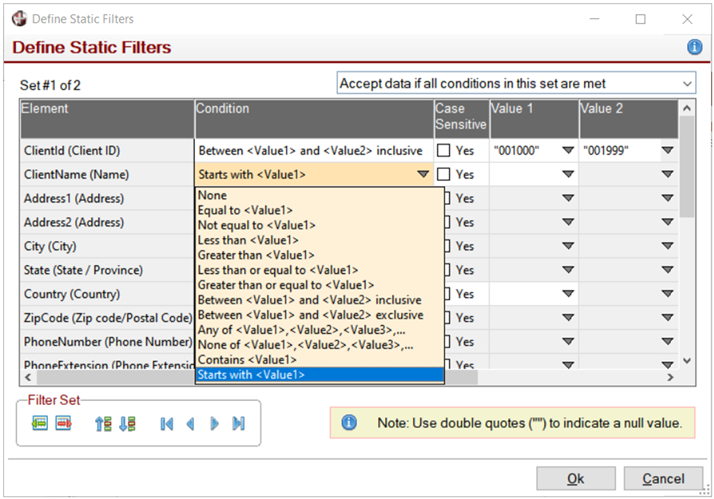 The Define Static Filters window is used to set up static selection criteria to filter the data for the report. Data is filtered based on filter sets. A filter set consists of one or more conditions, all of which must be true for the filter set to be true. For each filter set, select any conditions you wish to apply for each table element to be used in the filter.
