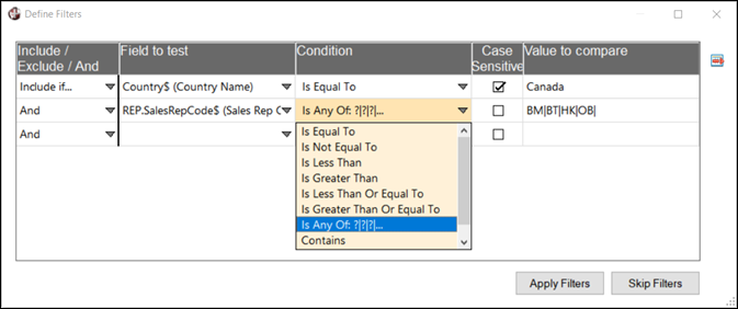 The drop down presents a list of conditions that can be applied to Dynamic filters: Is Equal To (The "Is Any of: ?|?|?|…" condition was added in PxPlus 2023.) | ||||||||||||