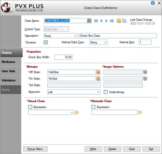 For new data classes created in PxPlus 2018, this check box is selected by default. For data classes created prior to PxPlus 2018, this check box is not selected by default. Select this check box to set dynamic control properties to Dynamic automatically when the data class is entered for a control in the Panel Designer. If Dynamic is not selected, dynamic control properties must be set to Dynamic manually after entering the data class for a control. See Dynamic Control Properties. (The Dynamic check box was added in PxPlus 2018.) | ||||||||||||||||||||||||||||||||||
