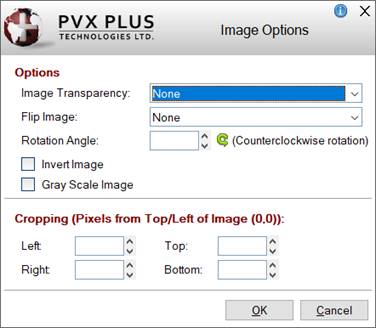(Available when Bitmaps for Off/On/3rd States are selected) Sets advanced image options for the bitmap. Click the Additional Image Options button to the right of the Image Options multi-line to invoke the Image Options dialogue. This dialogue consists of the following: