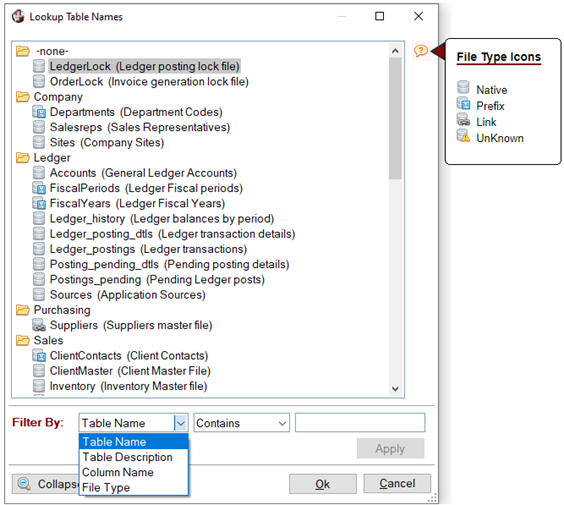 This list can be filtered by Table Name, Table Description, Column Name or File Type to make it easier to locate a specific table name.