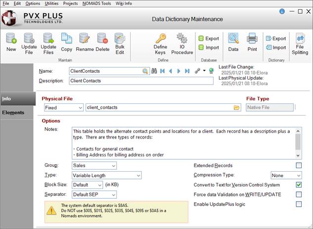 This information is updated automatically whenever a change is made in the data dictionary definition (i.e. updating the description, notes, options or elements, changing keys, etc.). This information is used by the Update Physical Files utility. (Last File Change was added in PxPlus 2021.) | |