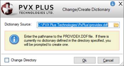Displays the Change/Create Dictionary window for changing or creating the pathname to a new providex.ddf file. Specify a different pathname by clicking the Query button or manually entering it. If no providex.ddf file exists in the pathname specified, a prompt will ask if you wish to create the dictionary. Responding Yes creates the dictionary files providex.ddf/dde in the pathname specified. Responding No does not create these files. If the Change Directory check box is selected, the directory containing the dictionary becomes the current working directory. (Support for creating a new dictionary was added in PxPlus 2019 Update 1.) | |