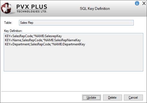 Opens the SQL Key Definition window that is used to create/remove the SQL key definition for a selected table. Button is hidden if providex.kdf does not exist. To create the providex.kdf file, select File > Create SQL Key Defn File from the menu bar. See SQL Key Definition. |