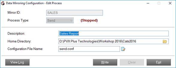 The Data Mirroring Configuration – Edit Process interface is displayed. This interface is similar to the Data Mirroring Configuration - New Process interface with a few exceptions: Mirror ID, Process Type and Clear are disabled, and a View Log button, similar to the one found on the main Data Mirroring Configuration interface, is displayed. The current status (i.e. Stopped) is indicated in red text next to the Process Type.