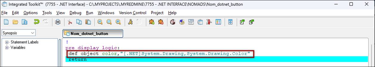You will now create a new object for Color. Insert this line and save the program: def object color,"[.NET]System.Drawing,System.Drawing.Color"
