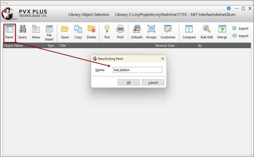 In Library Object Selection, launch the NOMADS Panel Designer by clicking the Panel toolbar button or selecting Objects > Panel Object in the menu bar. Enter the name of the new panel. For this example, enter the panel name: Net_Button Click OK.