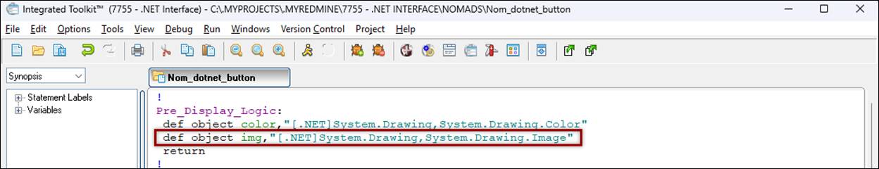 Load the default program, NOM_DOTNET_Button, which you created earlier. For this example, you will be defining another object called Image. The Image object will allow the placement of an image. Insert this line and save the program: def object img,"[.NET]System.Drawing,System.Drawing.Image"
