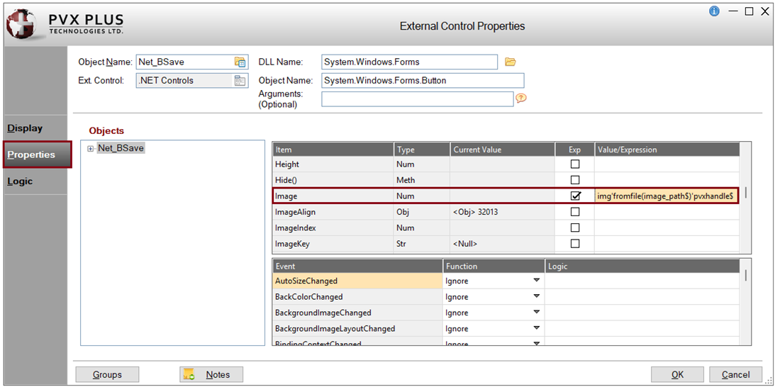 In the NOMADS Panel Designer, invoke the External Control Properties window. Click the Properties tab. In the first grid, look for Image in the Item column. Select the Exp check box and enter the Value/Expression: img'fromfile(image_path$)'pvxhandle$. The FromFile object will look for the specified image location. The Image will default to the center of the text. In the next set of steps, you will be changing the alignment.