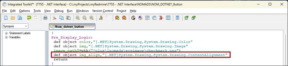 Load the default program, NOM_DOTNET_Button, which you created earlier. For this example, you will be defining another object called ContentAlignment. The ContentAlignment object will allow the alignment of an image. The default is Centered. For this example, you will be applying a Left alignment. Insert this line and save the program: def object img_align,"[.NET]System.Drawing,System.Drawing.ContentAlignment"