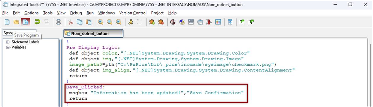 Load the default program, NOM_DOTNET_Button, which you created earlier. Insert this method and save the program: Save_Clicked: