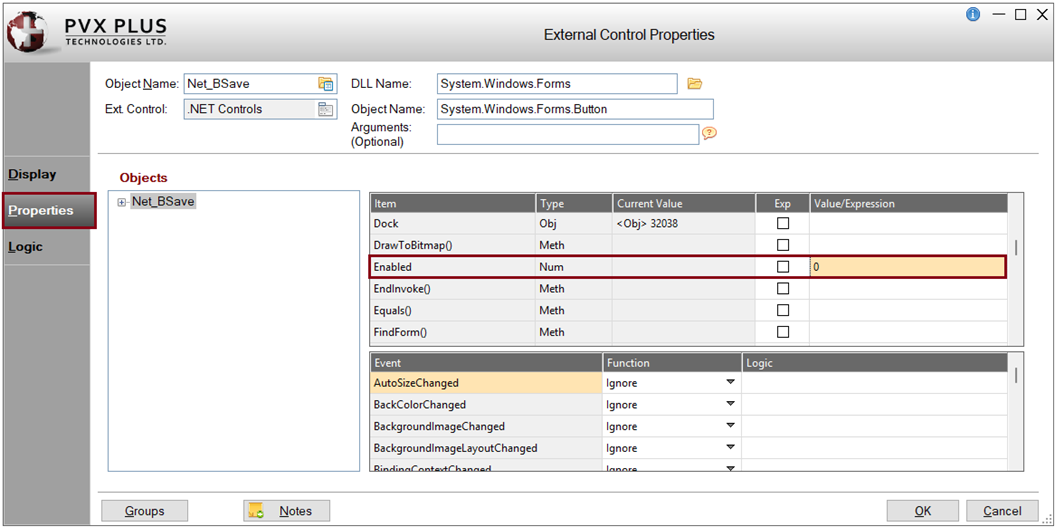 In the Extended Control Properties window, click the Properties tab. In the first grid, look for Enabled in the Item column. · If the button is to be Enabled, leave everything blank or enter 1 in the Value/Expression cell. For this example, enter 0 in the Value/Expression cell.