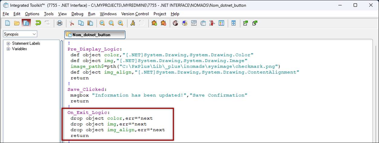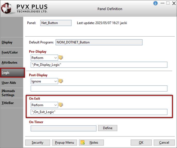 If the program is not already loaded in the editor, click the Program Logic button to the right of the drop box to load the default program, NOM_DOTNET_Button. Insert this method and save the program: On_Exit_Logic: