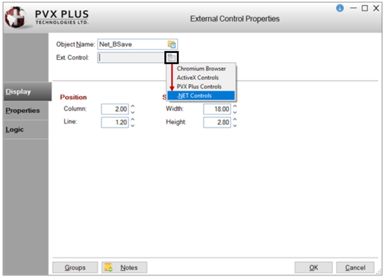 For the Ext. Control field, click the Query button. From the list that displays, select the type of External Control you want to create. For this example, select: .NET Controls
