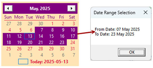 msgbox "From Date: "+fd$+sep+"To Date: "+td$,"Date Range Selection"