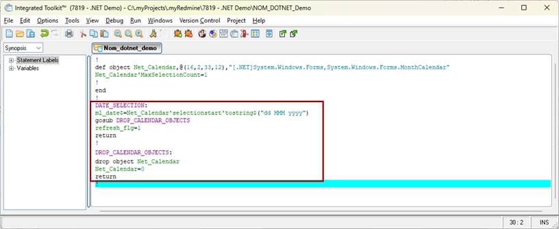 To begin, define the calendar object. Syntax: def object Net_Calendar,@(16,2,33,12),"[.NET]System.Windows.Forms,System.Windows.Forms.MonthCalendar" |