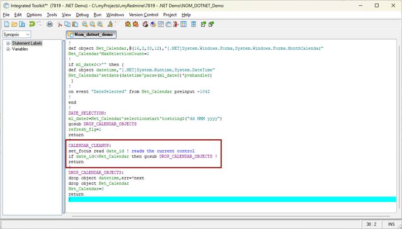 The ON EVENT syntax below places a CTL value into the input queue. Insert this line in the NOM_DOTNET_Demo program after the DEF OBJECT command: on event "DateSelected" from Net_Calendar preinput -1042 |