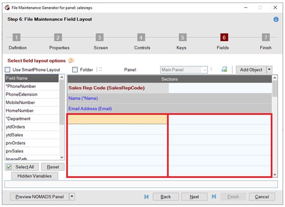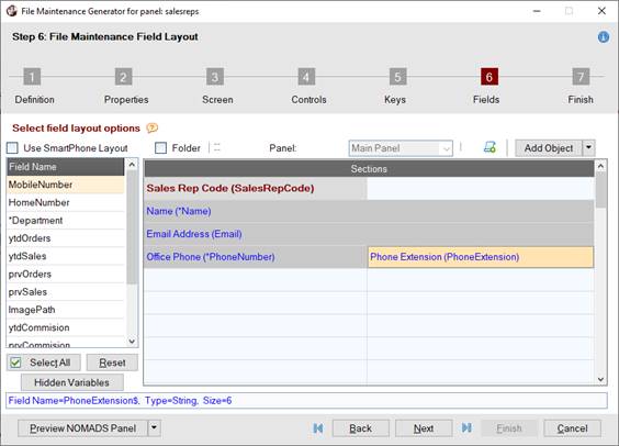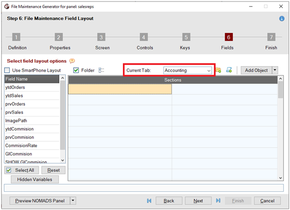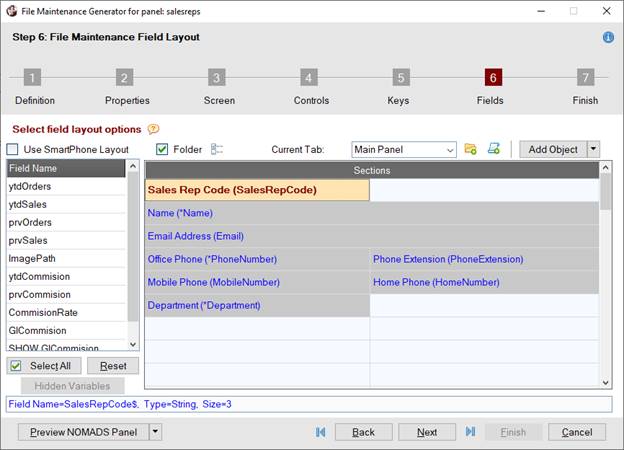 To define the field layout for the panel, proceed to Step 6: File Maintenance Field Layout by clicking the Next button five times or by clicking the number 6 button at the top. | |||