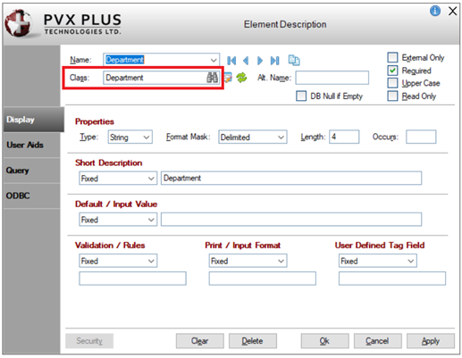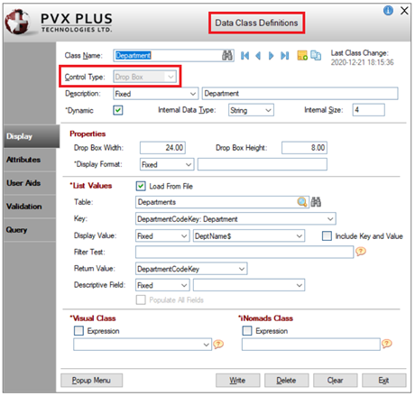 Select *Department. Drag and drop this field into the first column of row 6. In the Salesreps data file definition, the Department field is defined with a Drop Box type Data Class named Department. This will result in the input for the Department field being a Drop Box rather than a Multi-Line.