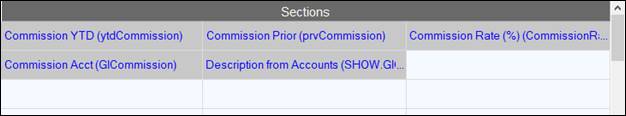 The SHOW.GlCommission field in the Field Name list box is not an actual element defined in the Data Dictionary. It is shown in the list box with all of the other elements because the GLCommission field has a Data Class of glAcct, which has Extended Validation defined to show the GL Account Description from the Accounts data file. Select SHOW.GlCommission from the Field Name list box. Drag and drop this field into the second column of row 2.
