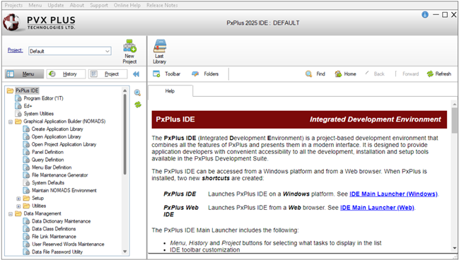The PxPlus Integrated Development Environment (or IDE) is a project-based development environment that integrates all of the various features of PxPlus in an easy-to-use interface. The PxPlus IDE can be accessed from a Windows platform or from a Web browser.