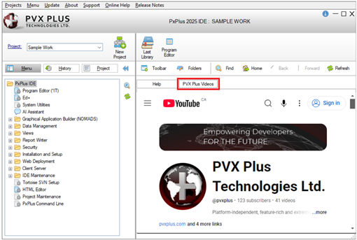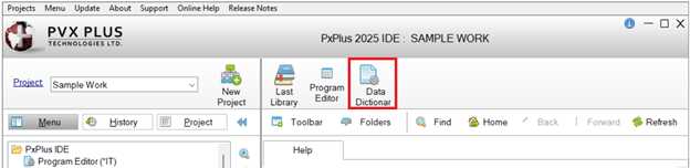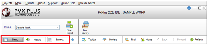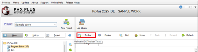 When launched from a Windows platform, the IDE can be displayed in enhanced view or in standard view. The main difference between these views is that the enhanced view has additional functionality and can be customized. You can add folder tabs to launch helpful Web pages with just a single click. A Help tab is already provided to display the PxPlus Online Help information for the current task. You can add buttons to the IDE ribbon toolbar to quickly access commonly used PxPlus tasks.