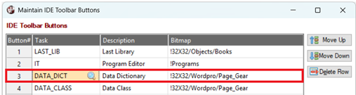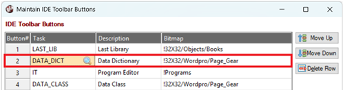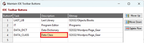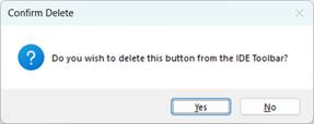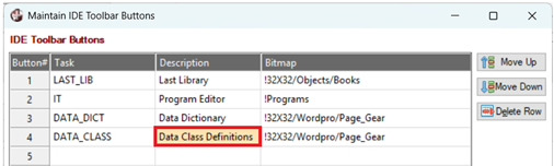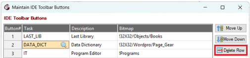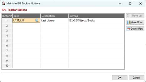 The Maintain IDE Toolbar Buttons window opens. It is used to add, maintain and delete task buttons in the IDE ribbon toolbar. |