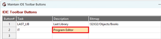 You will be adding Button #2 for the Program Editor (*IT) task. On the second row, under the Task column, enter IT. This is the Task ID for the *IT Program Editor. You can also select it from a list by clicking the lookup button (magnifying glass). |
