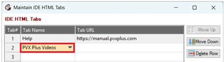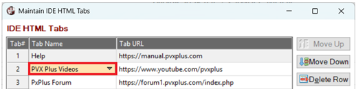 You will be adding Tab #2 to launch the PVX Plus YouTube page. Under the Tab Name column, enter PVX Plus Videos as the name to appear on the folder tab. |