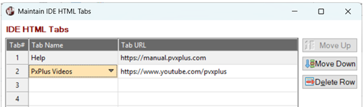 The Maintain IDE HTML Tabs window opens. Tab #1, which is named Help, is already provided. It cannot be modified, deleted or moved. |
