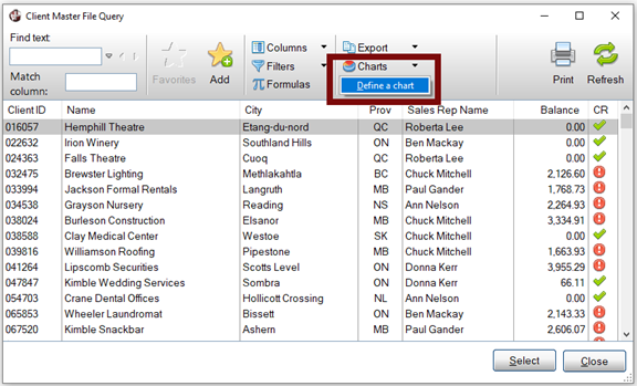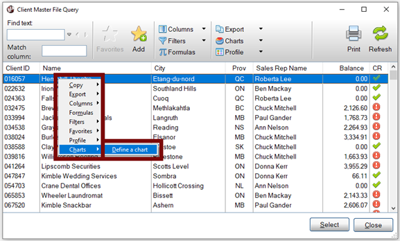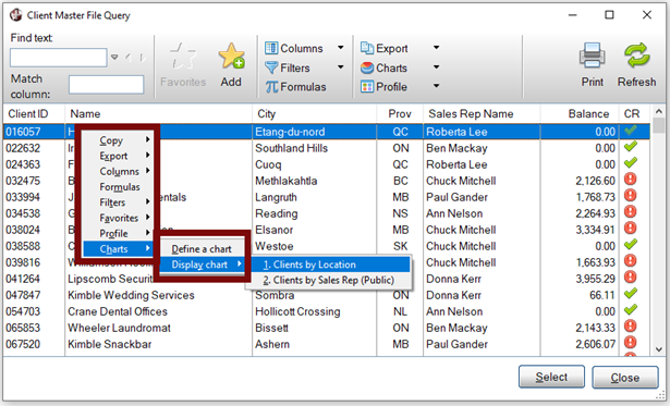 To display an AutoChart, click the Charts button at the top of the Query or right click on the data list to invoke the popup menu. If an AutoChart definition exists for the control, a Charts > Display Chart option will display in the popup menu.