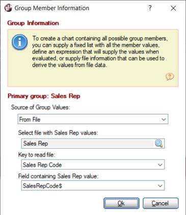 To create a chart containing all possible group members, you can supply a fixed list with all the member values, define an expression that will supply the values when evaluated, or supply file information that can be used to derive the values from file data.