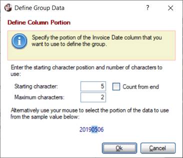 The grouping of the data can be based on a portion, rather than the whole value, of the column. To specify what part of the value to use, click the Define portion of the column value to use hyperlink button to invoke the Define Column Portion window.