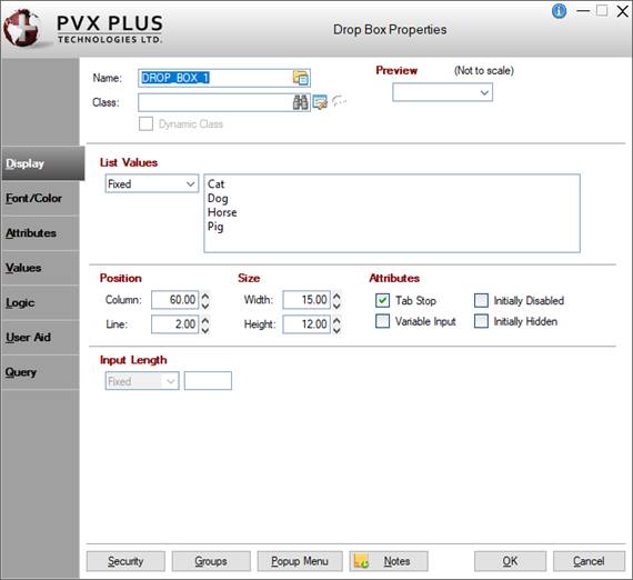 This dialogue is divided into the following tabbed panels for viewing and/or changing Drop Box properties: Display, Font/Color, Attributes, Values, Logic, User Aid and Query.