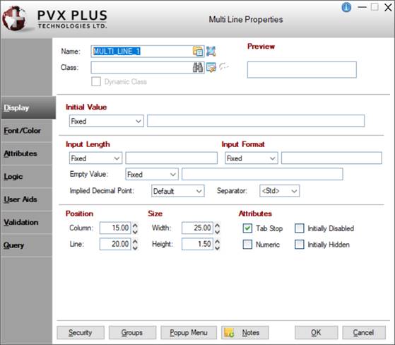 This dialogue is divided into the following tabbed panels for viewing and/or changing Multi-Line properties: Display, Font/Color, Attributes, Logic, User Aids, Validation and Query.