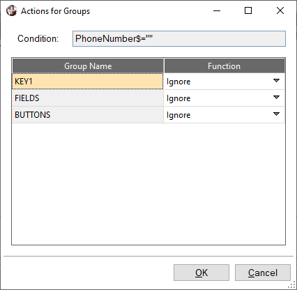 (Applicable for NOMADS Panels Only) Assigns functions to be applied to selected groups when the Condition tests true. Click the dotted button to invoke the Actions for Groups window. This window consists of the following: