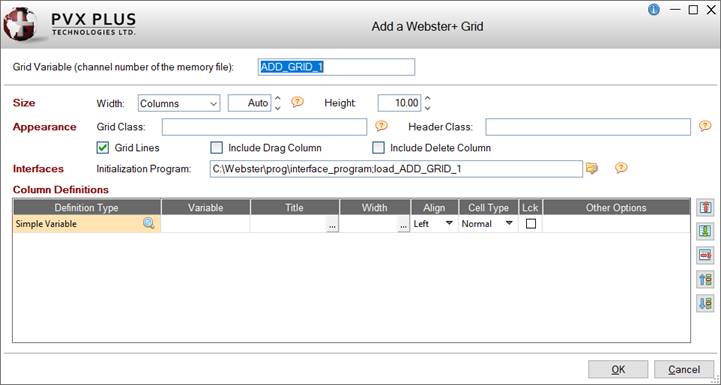 The Add a Webster+ Grid window is used to add (and edit) a Grid control on the file maintenance HTML page only. It is not available for file maintenance NOMADS panels.