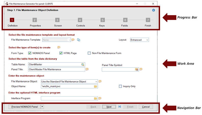 Each step in the File Maintenance Generator presents a panel with three main sections: a Progress Bar, a Work Area and a Navigation Bar: