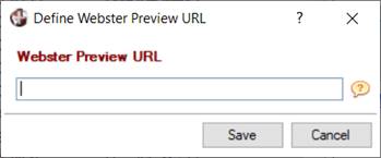 Launches a separate window for entering a valid URL, which is required to preview an HTML page created by the File Maintenance Generator. A Web server must be running and pointing to an installation of Webster+. The URL should specify the server and the Port number, separated by a : (colon). Example: localhost:8088/ (indicates that the Web server is running on your local machine on Port 8088) |