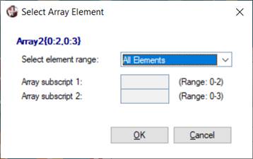 Displays a list of files (the main data file/table and any defined link files) and their elements. Icons next to each element indicate whether the field is a string, numeric or date (i.e. DATE class) field. (Manual files have no elements listed.) Array elements are displayed with their dimensions in braces; e.g. Month${1:12}. Items can be selected from this list for addition to the Columns list for display in the query. Select an item by double-clicking on it, by highlighting it and clicking a selection button, or by selecting the Add option from the right-click popup menu associated with the item. Popup menus associated with the main file and cross-reference files also allow you to add fields from the respective files. When an array is added as part of an "add all fields" or "add all fields in file" scenario, all the elements in the array are automatically added to the Columns list. If the array alone is selected from the File Elements list, the Select Array Element window is displayed to allow you to select all elements or select a single array element by specifying its subscripts. This window consists of the following: