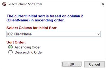 (Query+, Not Applicable to Drop Tree Query) Click the link to invoke the Select Column Sort Order window to specify a column to sort by (ascending or descending) after the query is loaded. This overrides the default sort sequence, which is determined by the key selection in the query header. The column sort affects the initial load only; subsequent reloads will maintain the last column sort used in the query. This window consists of the following: