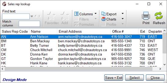 (Classic Query and Query+ Drop Tree Query) Tests the current query definition. (Query+ Toolbar, Hybrid, Menu and Drop Query) When testing the query, many of the run-time features are disabled, such as Favorites, Filters, Formulas and Profiles. See Run-Time Query. The Columns feature is enabled to allow the developer to use the Show/Hide/Reorder Columns option to initially show and hide and reorder the columns. Column widths can also be adjusted by dragging the edge of the column header to the desired width. The size of the query panel itself (except for the Drop Query) can also be resized by dragging the edges of the panel. These new settings can be saved and incorporated into the query definition by clicking the Save + Exit button when exiting the query. Be sure to save the current query definition to ensure that all changes are saved. Example: Below is an example of a query displayed in Test/Design mode: (The Test/Design button was added in PxPlus 2023 Update 1.) | |