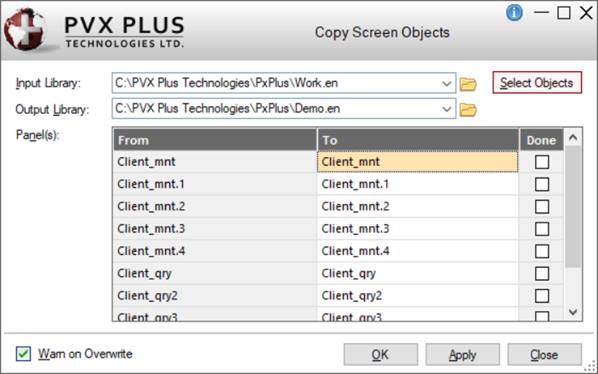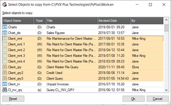 (Support for object selection, multiple copy operations and output library creation was added in PxPlus 2021.)