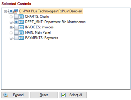 If the search criteria is based on Control Type = Panel Header, only library and panel nodes are loaded into the Selected Controls tree view list box. If the search criteria is based on Control Type = Library Defaults, only library nodes are loaded into the Selected Controls tree view list box. Right clicking on a panel node or control node invokes a popup menu for quick access to Library Object Selection and the NOMADS Designer. When right clicking on a library node, only the Library Object Selection option is available. (The right-click popup menu was added in PxPlus 2018.) To select all libraries/panels/controls in the tree view, click the Select All button. Note: | ||||