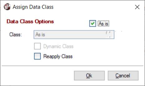 Choose an existing data class to be applied. Deselect the As is check box. In the Class field, enter an existing data class by using the Query button (binoculars) or typing a valid data class name. |
