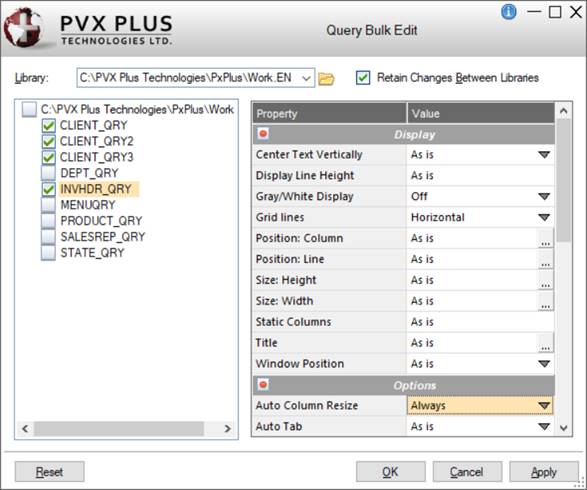 Displays the current value assigned to a given property. The method for entering or displaying these values is dependent on the property type. By default, values are assigned the As is option to indicate that the current/default setting for a given property will be maintained "as is" for the queries selected. The Reset button can be used to reset all the property values to As is. Some of the Display properties allow you to set new size and position values across all selected queries, but they also include Increase and Decrease options for adjusting each currently set value by a specified increment (decrement) amount. Drop box style cells are identified by a down arrow button, which indicates that pre-set selections are available; e.g. Center Text Vertically, Gray/White Display, Grid lines, etc. Query style cells are identified by a three-dotted button. These cells are often associated with more than one field, and clicking the button invokes a separate dialog for entering/changing field values. The dialog that is invoked varies depending on the property. Double clicking inside the cell either invokes the same dialog as the dotted button or allows values to be entered directly into the cell. (The ability to double click inside a Query style cell was added in PxPlus 2023.) |