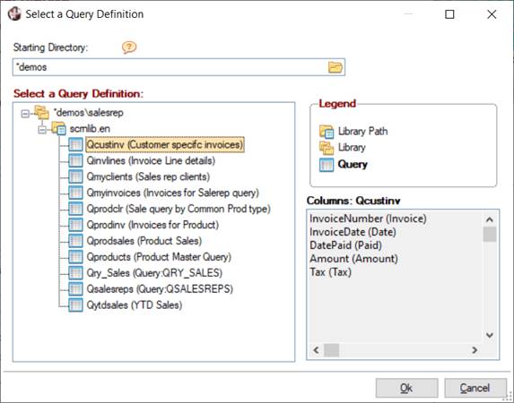 Smart Controls use a Query object definition to determine the content of the Smart Control in terms of file selection, column definition and selection criteria. A Query List object consists of a query-like definition that is used exclusively by Smart Controls to auto-load a list of records from a data file or database table. This type of definition is a subset of the Standard Query with header information containing the file and key information only and the column definitions having limited options.