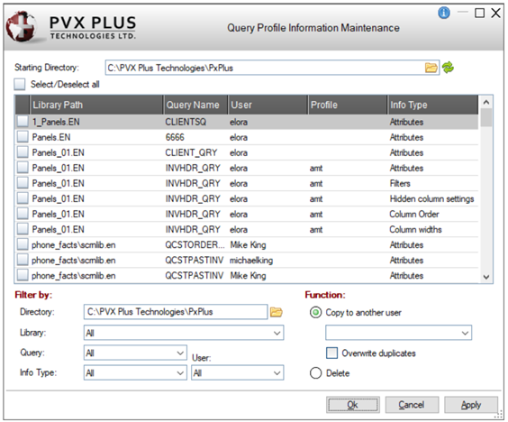 Entries include the library location (relative to the starting directory), the name of the query, the user to whom the entry pertains, the profile name (see Query Profiles), and the type of information stored. Note: