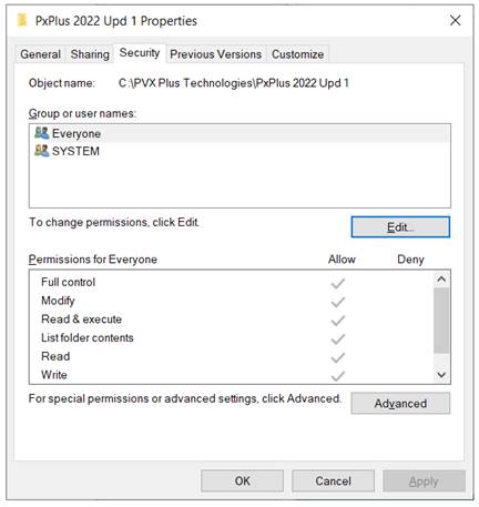 To resolve this issue after the software has been installed, use Windows Explorer to modify the properties of the path to where PxPlus is installed:
