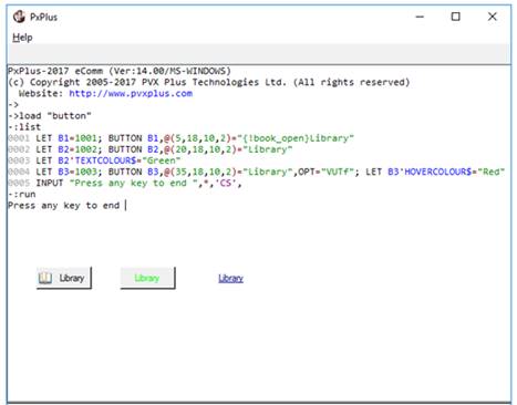 The first button contains a bitmap of an open book and the text "Library". The PxPlus installation includes a group of internal bitmaps available for use in control objects identified by a leading ! exclamation point in the syntax. Braces indicate that the bitmap is to be placed on the button. See Displaying Bitmaps/Icons.